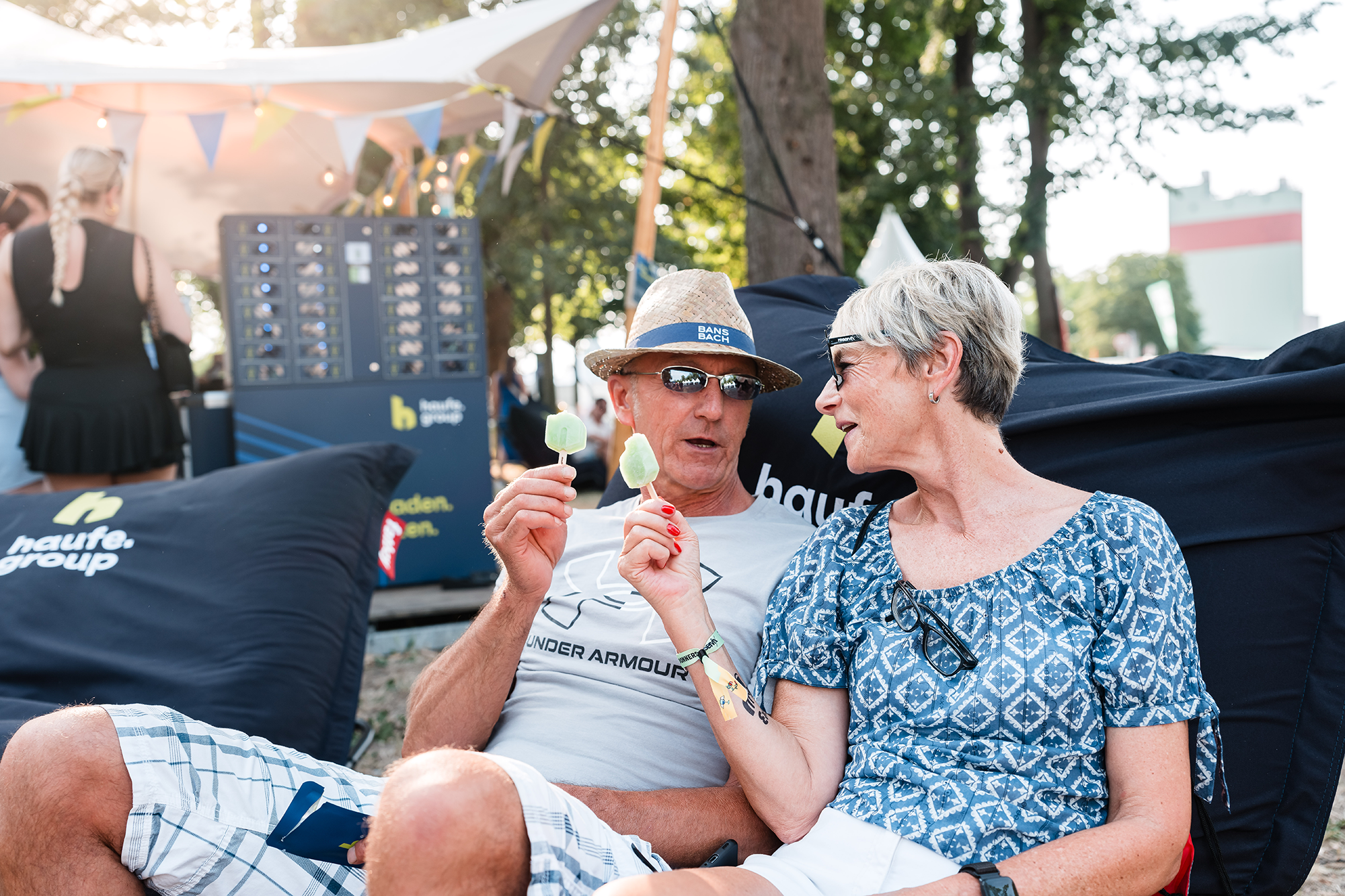 For those needing a break from the action, our Haufe Group area offered a welcoming retreat under shady awnings adorned with colorful fairy lights. One of the biggest hits was our video campaign: visitors stepped onto a small stage in front of the Haufe Group wall with instruments and props to create their own mini-performance. They walked away with slow-motion videos as fun souvenirs that sparked plenty of laughter! Our mobile charging station also proved popular—festivalgoers could securely store their phones in lockers equipped with integrated charging cables while taking time to enjoy one of our refreshing Haufe Group ice creams.